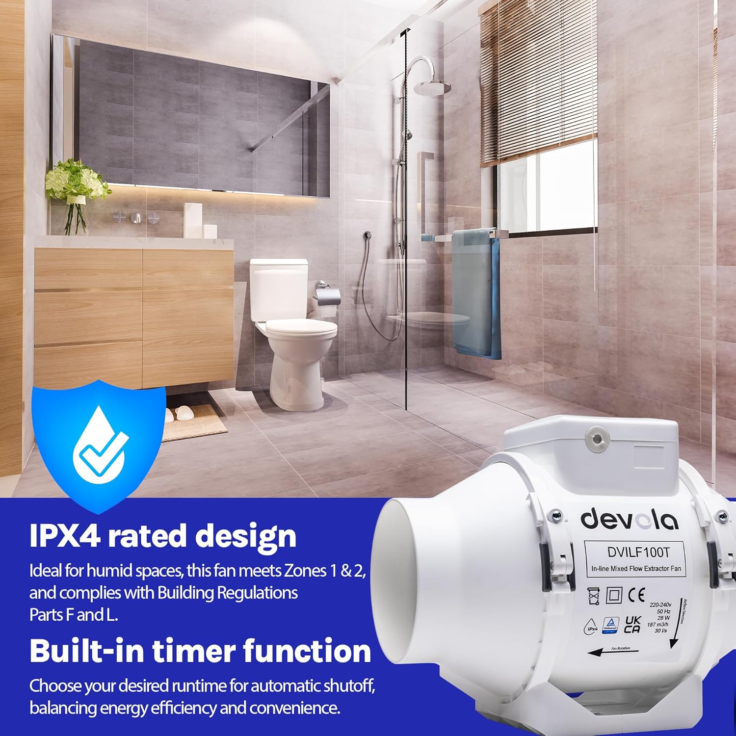 Devola 100mm In-Line Mixed Flow Extractor Fan with Timer - DVILF100T