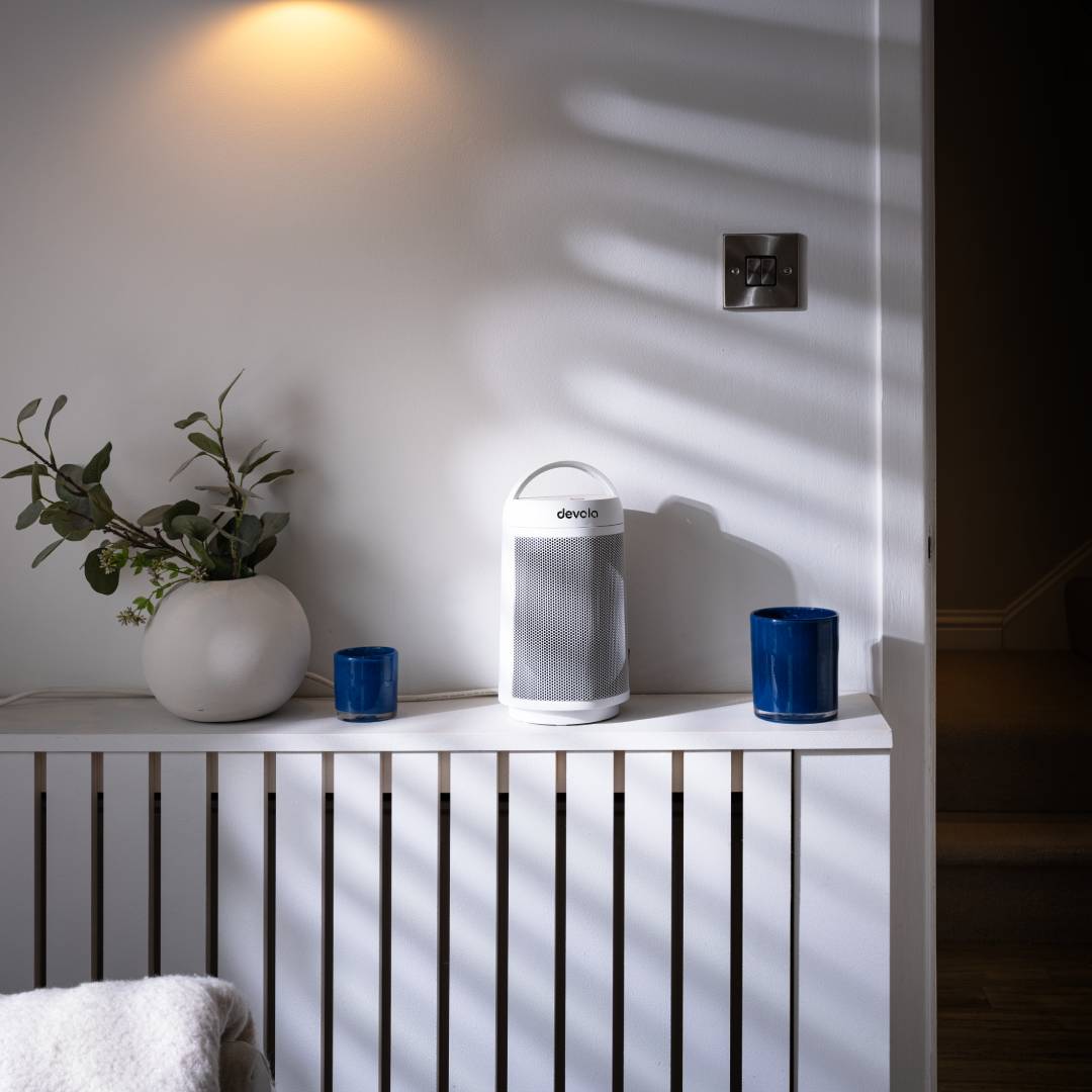 Stay warm and comfortable through the colder months with the Devola 1500W Portable Ceramic Fan Heater. Lightweight and easy to move thanks to its integrated carry handles, this compact unit combines efficient ceramic heating technology with a sleek, practical design. Ceramic elements warm up quickly, distribute heat evenly, and stay cooler to the touch than traditional metal coils — offering both performance and peace of mind.