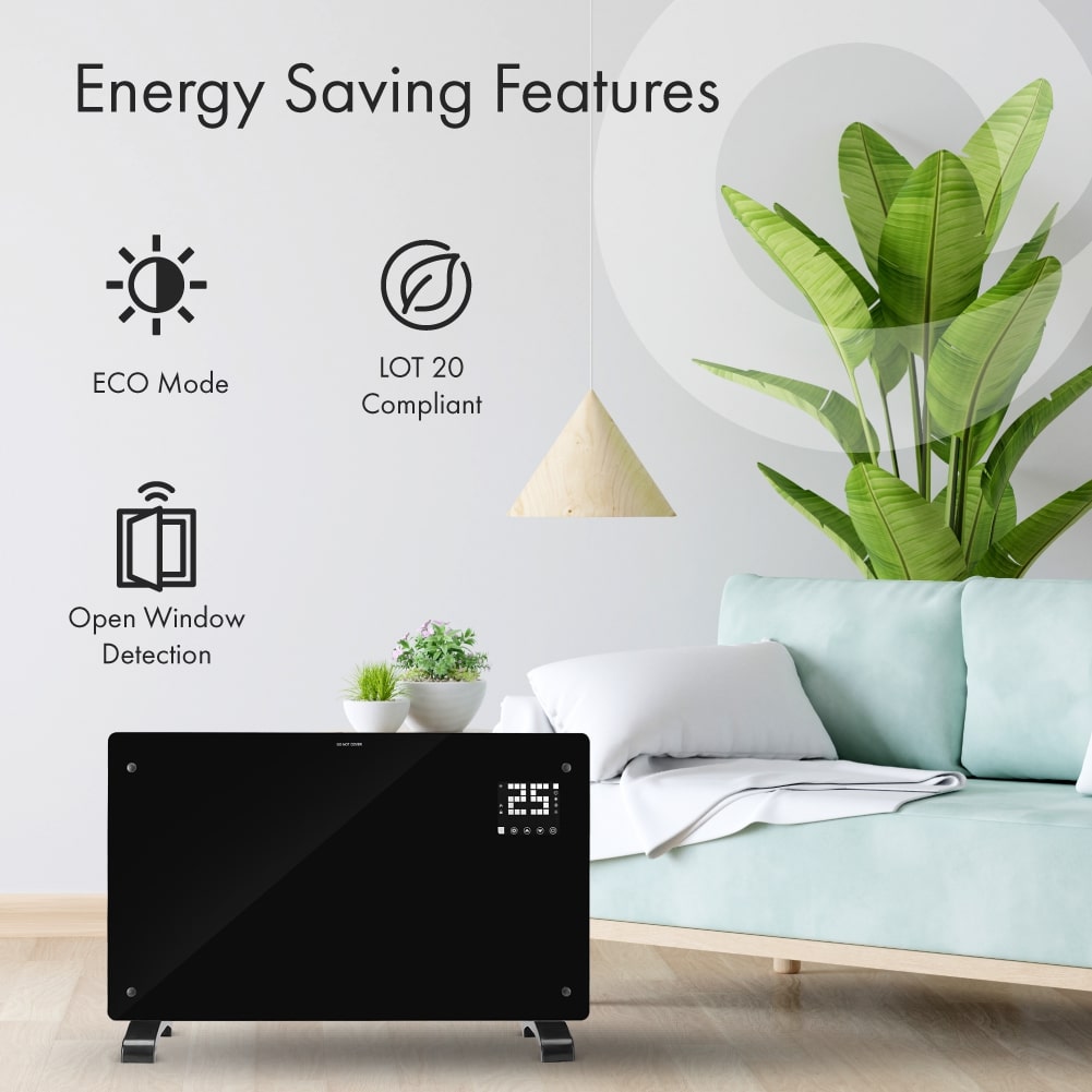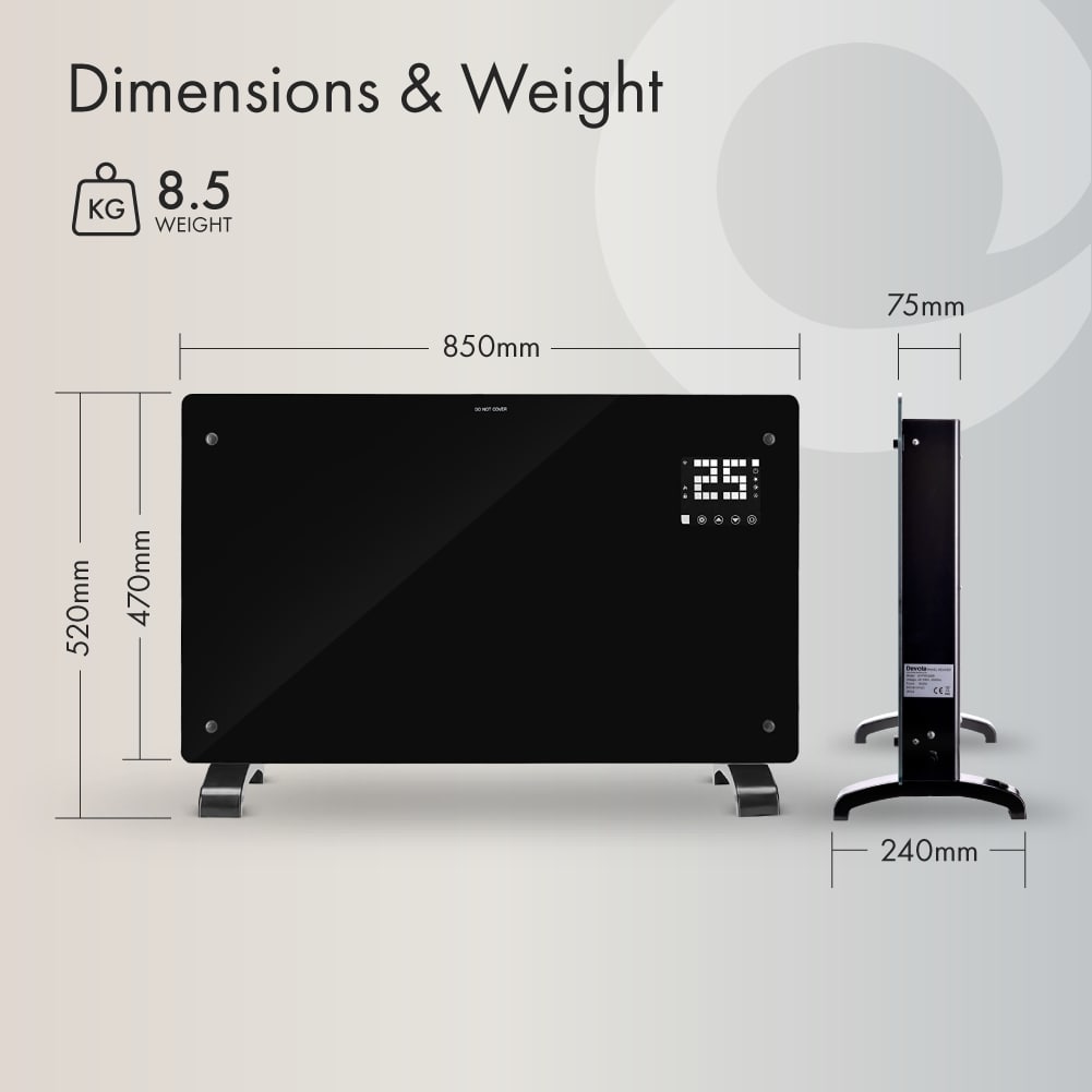 This Devola 2.5kW glass panel heater is one of the most technically advanced models on the market. Boasting a Wi-Fi connectivity function, it can be used in accordance with various smart home devices. It has a contemporary slimline profile and can complement any room with its tempered glass housing and modern LED display (which can be switched off if required).