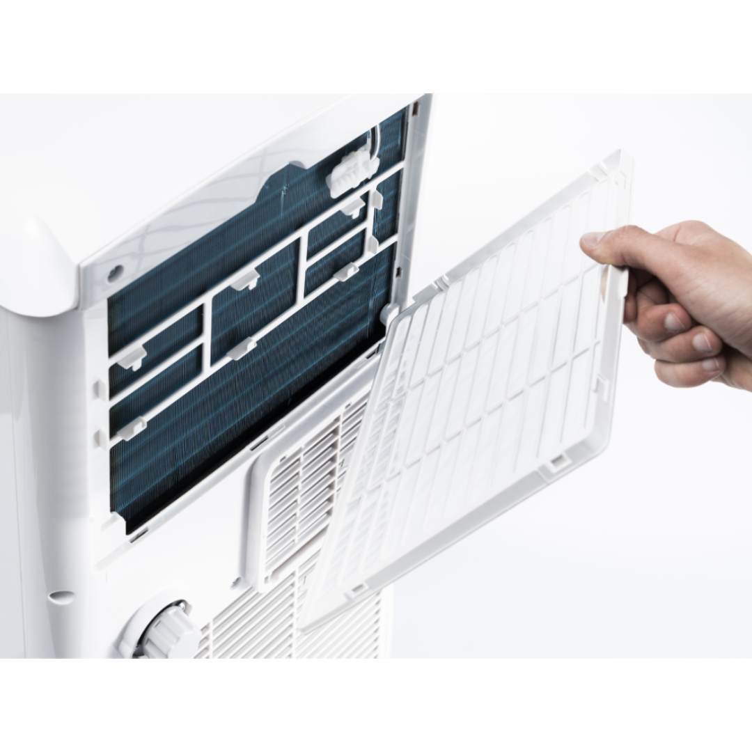 Beyond cooling, the Dolceclima Compact 10 P offers exceptional moisture control with a dehumidification rate of 2.3 litres per hour—a vital feature for maintaining indoor air quality and comfort. During summer, condensate is atomised and expelled outdoors via the included 1.5 m flexible exhaust hose. In non-summer months, moisture is collected in a tank and can be drained through a supplied hose. A removable dust filter captures airborne particles, enhancing air purity while ensuring the internal system runs efficiently.