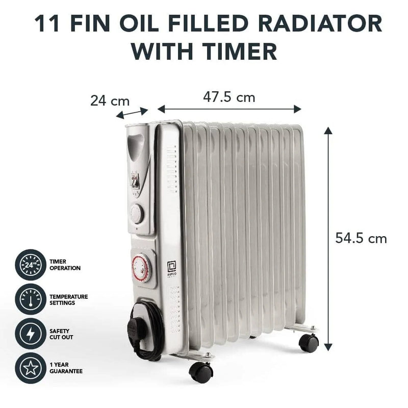 Pifco 2.5kW White 11 Fins Oil Filled Radiator With Timer - PIF203885