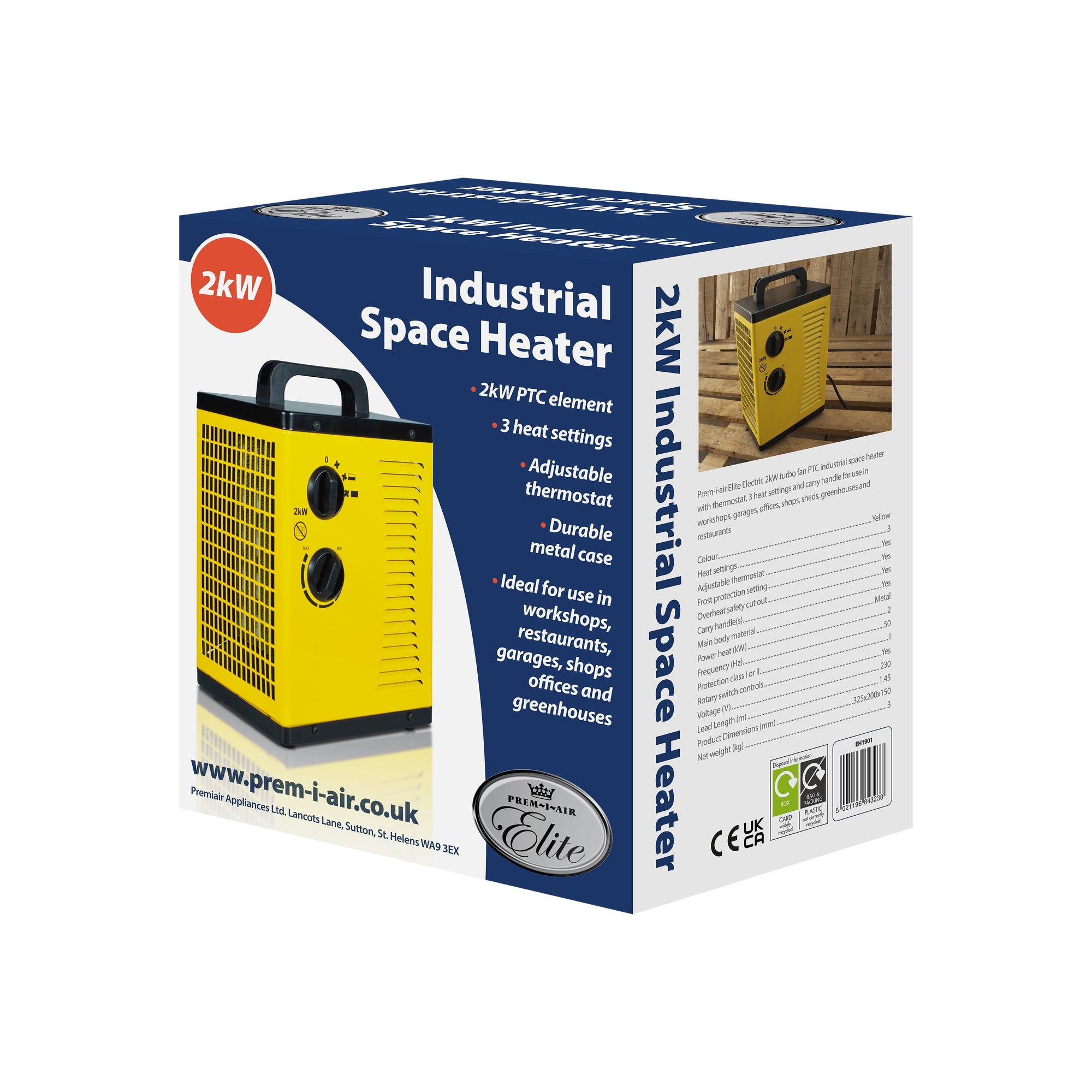 This Prem-I-Air 2kW PTC fan heater is perfect for heating industrial spaces. Boasting 2 heat settings (1kW/2kW) and a cool air function, it can be used all year round. The heater is quiet in operation and features a convenient foldable carry handle, which is ideal for storage and transportation. The product has a 1.4m cable for optimum reach. Safety assured; this heater comes with dual overheat protection.
