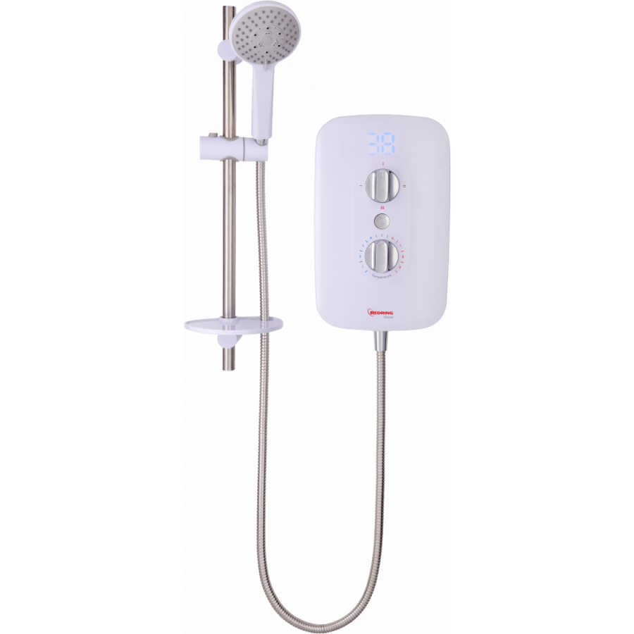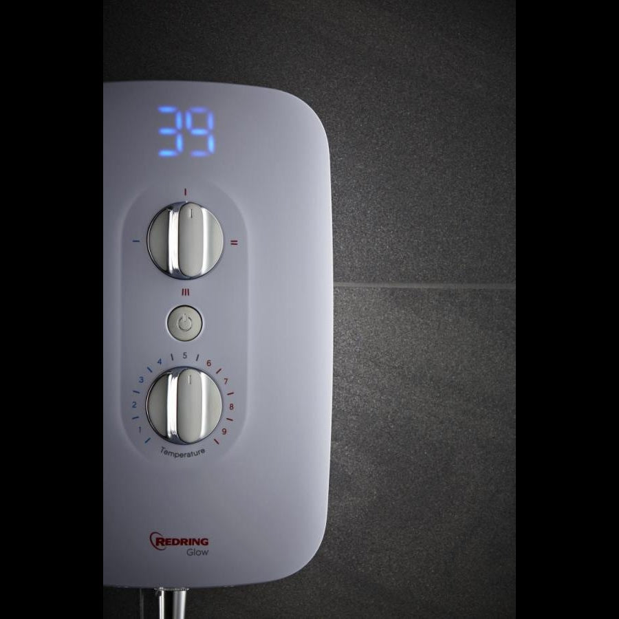 Redring's range of Glow instant electric showers are a premium domestic option featuring phased shutdown anti-scaling safety technology, push-button Start/Stop control and a 3-year UK warranty. With chrome accent controls and an illuminated digital temperature display, Glow showers combine attractive design features with SmartFit connectivity to improve the experience for user and installer. With enhanced shower accessories Glow showers are an appealing package for both installers and homeowners.