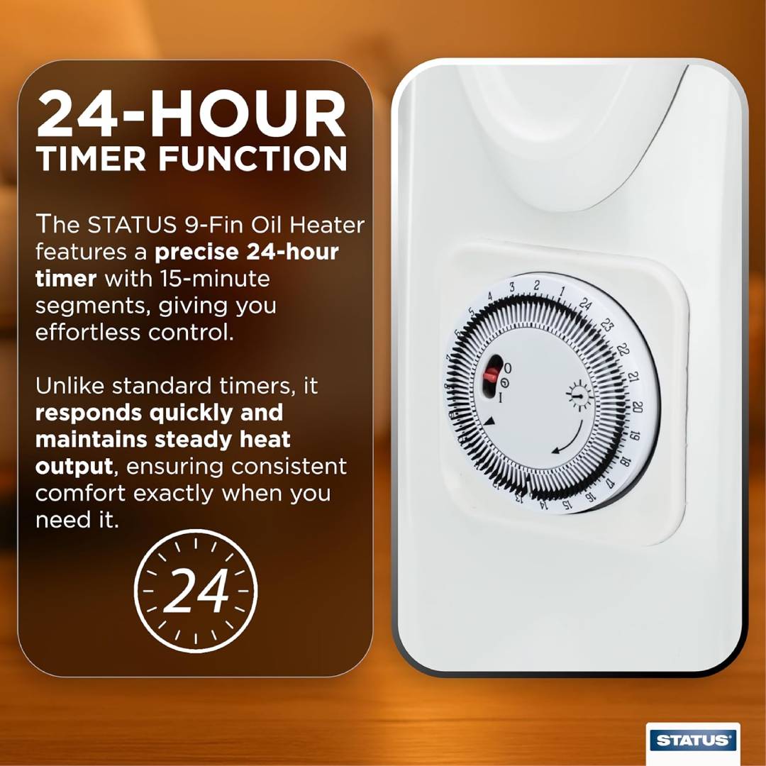 The Status OHF9-2000WT1PKB 2000W Oil-Filled Radiator with Timer delivers robust and controllable warmth for medium to large rooms, while giving you the convenience of built-in scheduling. With a power output of 2,000 W, this 9-fin unit offers strong radiant heat, while the integrated timer function enables you to programme on/off cycles to match your lifestyle and avoid wasting energy.