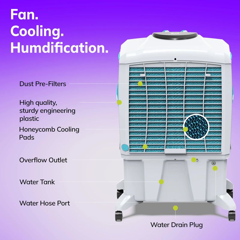 At the heart of the cooler is a robust axial fan engineered to generate high air delivery with consistent pressure, ensuring rapid cooling across wide zones. The unit consumes just 190 watts, making it a cost-effective and energy-efficient alternative to traditional air conditioning systems, particularly in dry and semi-humid climates. The fan system works in tandem with a three-sided honeycomb cooling pad arrangement that maximises surface area for evaporation, enabling enhanced moisture retention and optimal cooling performance. The specially re-engineered pads are built from high-grade cellulose material with a dense honeycomb structure that resists deterioration over time and offers superior airflow resistance for deeper, longer-lasting cooling.