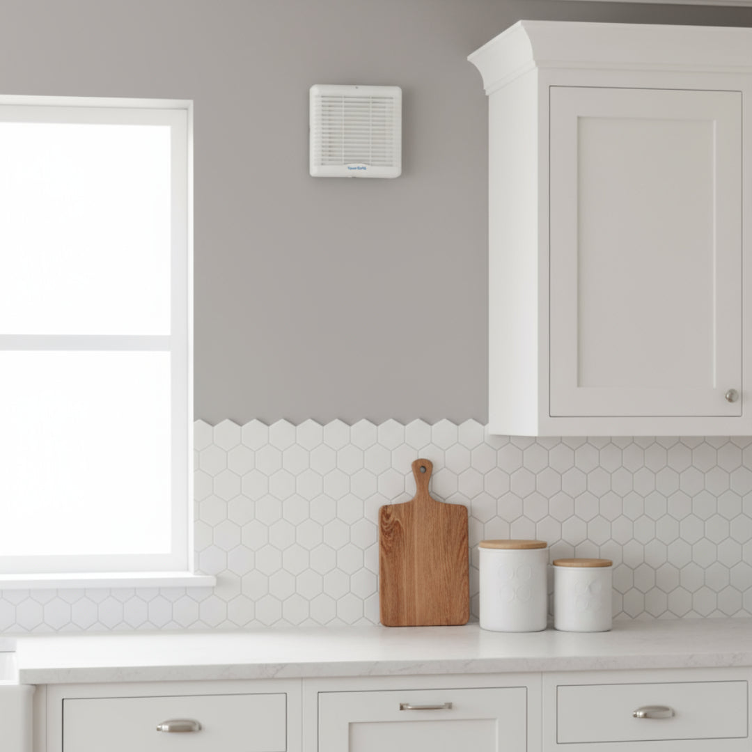 Humidistat controlled kitchen extract fan with adjustable overrun timer (3-25 mins) Humidity adjustment 62-82% RH.